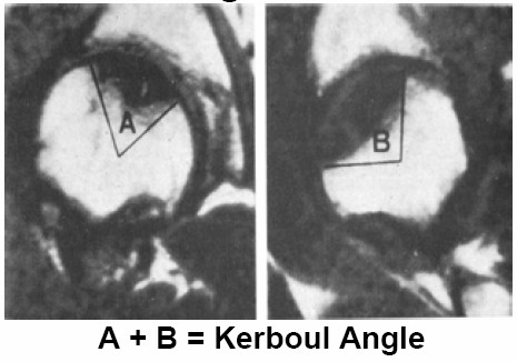 This system did not quantify the extent of the condition and multiple extensions have been proposed. One example is the "Combined Necrotic Angle" proposed by Steinburg. To calculate, first the center of the femoral head is identified. Two lines are then drawn from this point to the borders of the lesion on both AP and Lateral radiographs. The sum of the angles on the AP and Lateral radiographs is the Kerboul angle. Lesions are classified as small, medium, or large: