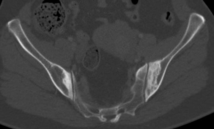 Osteitis condensans ilii is identiifed as benign sclerosis of the ilium adjacent to the sacroiliac joint. It is typically bilateral and symmetrical, and tends to be triangular in shape. This radiological abnormality is thought to be a benign reflection of bone remodelling with response to stress (increased radiologic density indicative of sclerosis) the sacroiliac joint itself is normal with no irregularity, erosions or loss of joint space.